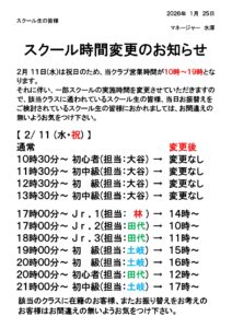 2月11日は祝日のため営業時間が短縮されます。当日実施される一部スクールに時間変更がございますので該当クラスに通われている方、お振替を検討中の方はお間違えの無いようにお気を付けください。